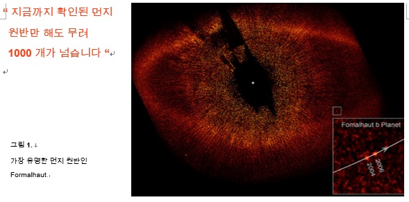 오늘 알아보고자 하는 천체는 별의 나이가 중장년이 되어야만 볼 수 있는 천체 입니다. 태양계를 구성하고 있는 천체를 알아보면 중심 한 가운데에 (쌍성이 아니라 가정했을시) 위치해 있는 별 (S-tar), 그 별을 도는 행성 (Planet) 들, 그 행성을 도는 위성 (Sat-ellite), 왜행성 (Dwarf planet ) 그리고 다양한 크기의 미행성 및 각종 먼지 등이 있습니다. 지구에서 다른 태양계를 관측한다면 별과 가까운 부분은 밝게 빛나지만 별로부터 멀리 떨어진 부분은 빛보다 어둠에 훨씬 가깝습니다. 오늘의 주제이자 태양계에서 별과 조금 멀리 떨어져서 별을 크게 감싸고 있는 부분인 먼지 원반은 바로 이 어둠속에 있습니다. 토성 (Saturn) 은 누구나 좋아하는 멋진 띠를 두르고 있습니다. 그 띠를 별에 적용시켜서 별이 아주 큰 띠를 두르고 있다고 생각하시면 됩니다. 쉽게 말해서 별과는 약간 먼 거리에 형성되어 있는 고리 모양의 별을 둘러싸고 있는 원반이죠. 별을 둘러싸고 있는 띠도 시간이 흘러감에 따라서 진화를 하게됩니다. 초기에는 원시 행성계 원반의 형태로, 후기에는 먼지 원반의 형태로 진화하게 됩니다. 이 먼지 원반은 대부분 시간이 적당히 지난 (~ 10만년) 주계열성 (Main Sequence star) 의 태양계에 나타나며 (이 때문에 많은 먼지 원반 관련 시뮬레이션 코드는 대문자 M을 포함하게 됩니다) 무수한 먼지와 파편 등으로 이루어집니다. 2010년 현재 1000개 이상의 먼지 원반이 주계열성 주위에 존재하는 것으로 확인되었습니다. 가장 유명하고 정확히 관측된 먼지 원반으로는 포말하우트 (Fomalhaut, 그림1) 별의 원반이 있습니다. 아주 이례적인 예로 중성자별을 둘러싸고 있는 먼지 원반도 발견되었습니다. 이는 조금 더 연구가 필요할 듯 보입니다. 이유는 차차 설명하겠습니다.