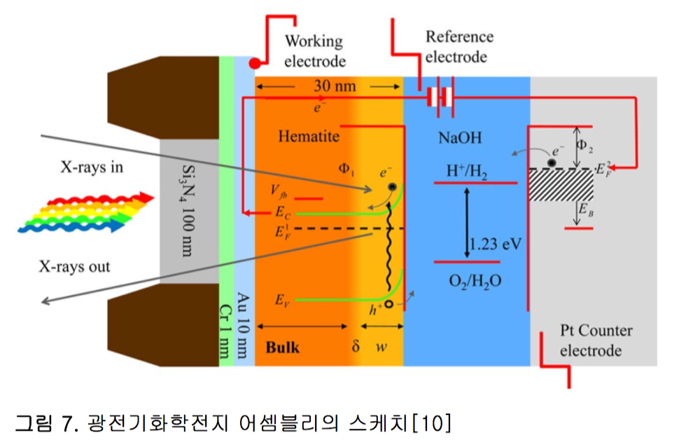 새로운 분석법을 이용한 Fe2O3 광양극 분석법을 마지막으로 Fe2O3 에 대한 보고를 마무리 하고자 한다. 여기서 자의적 관점에서 진보된 분석법이라고 소개하고자 하는 것은 In-situ photoelectrochemical (PEC) X-ray absorption spectroscopy (XAS) 이다. XAS, 특히 electrochemical XAS 는 진보된 분석법에 속하기는 하나, 그리 새로운 것은 아니라고 생각할 수 있다. 그러나, In-situ PEC XAS 를 이용한 결과는 매우 드물기에 여기에서 다루고자 한다.